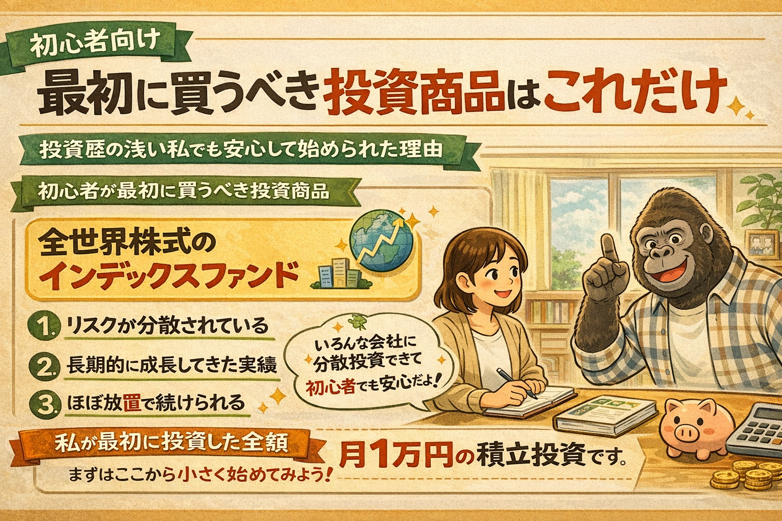 結論から言うと、**初心者が最初に買うべき投資商品は「全世界株式のインデックスファンド」**です。